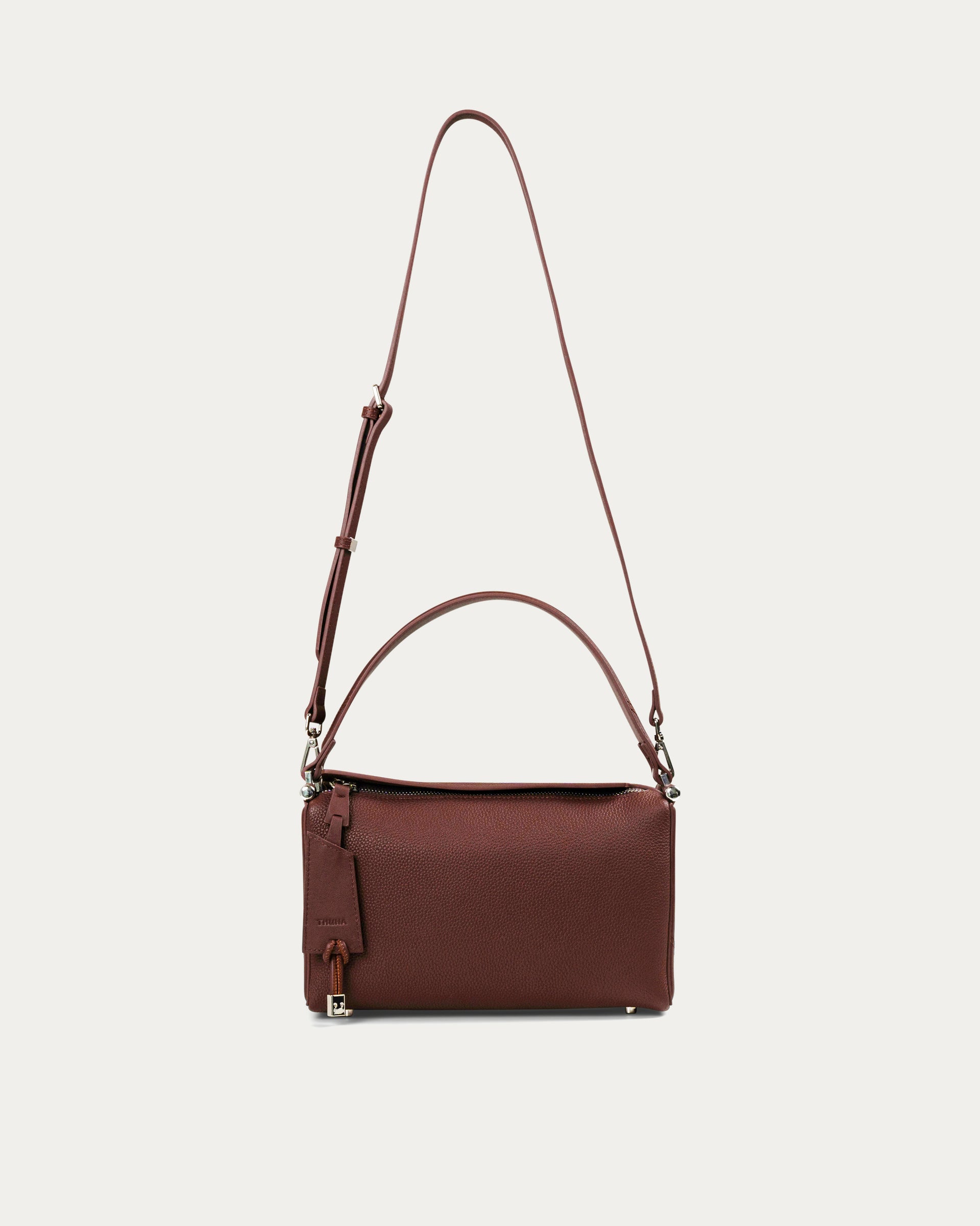 Blends functionality with style. Crafted from durable pebbled leather, it features a modern asymmetrical opening and a detachable pouch for easy organization. Practical yet sophisticated, it’s the perfect companion for workdays and weekends alike.